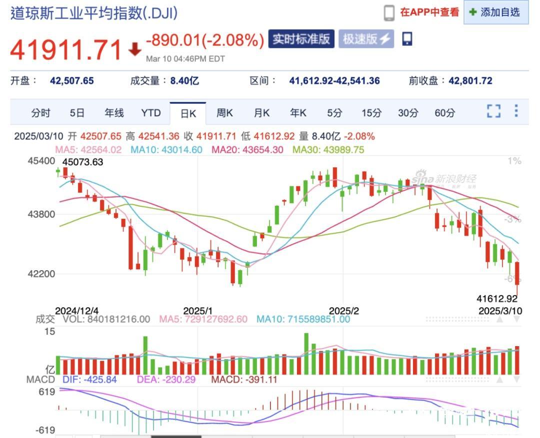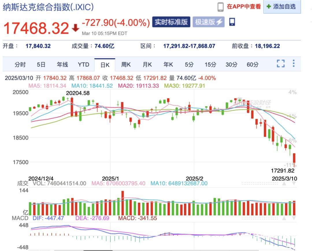 北京时间3月11日凌晨,美东时间3月10日下午美股遭遇了“黑色星期一”,美国三大股指全线大跌。收盘,纳指跌4%,创2022年9月以来最大单日跌幅;道指跌2.08%,标普500指数跌2.7%。